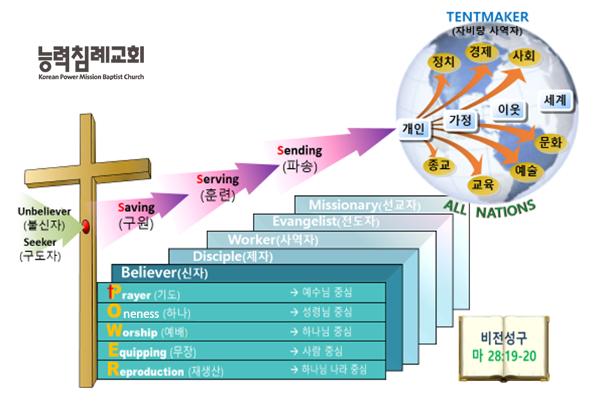 | 5자 | 신자(Believer) -제자(Disciple) -사역자(Worker) -전도자(Evangelist) -선교자(Missionary)로 훈련받아 성장하면서 주님을 섬기고 세상을 복음화 시키자는 정신을 가지고 있습니다. |
